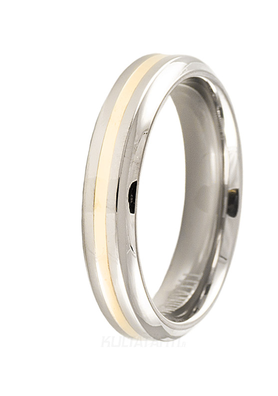 Titaanista valmistettu kihlasormus, jonka keskustaa koristaa 9 karaatin keltakullasta valmistettu panta. Sormuksen poikkileikkaus on sivulta viistetty flakka ja sen sisäpuoli on pyöristetty miellyttävän käyttömukavuuden aikaansaamiseksi.