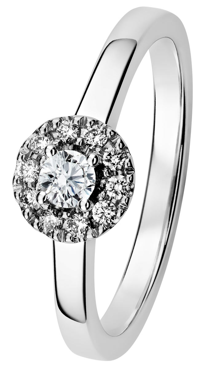 Pyöreässä halo-istutuksessa säteilee 0,9ct timantti. Istutusta ympäröi 10 x 0,01H/SI.