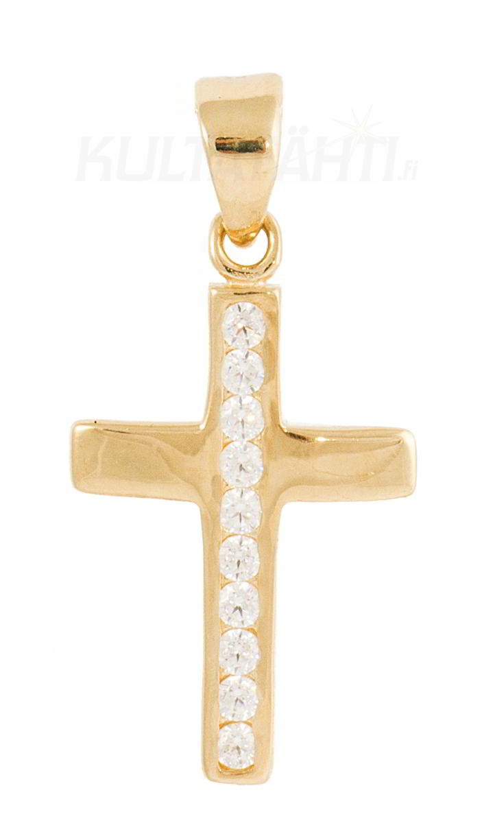 Näyttävä kultainen rippiristi, jossa säihkyy kirkkaat zirkonit. Risti on valmistettu 14 karaatin keltakullasta ja sen vaakapuun kärjet kapenevat hieman kärkiä kohden, luoden ritsille kauniin sulavan muodon.