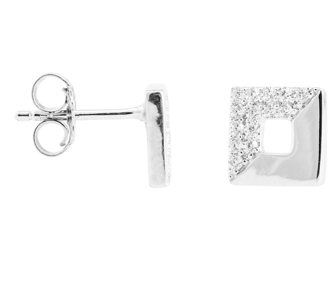 Tyylikkäät, ruudun muotoiset hopeiset korvakorut, joissa korun alaosa on koristeltu zirkoneilla.