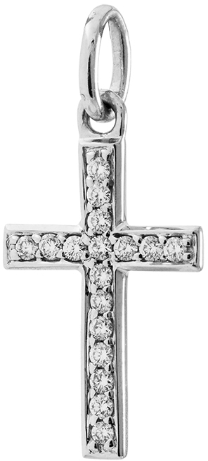 Kaunis valkokultainen risti, jonka pinnassa säihkyvät aidot timantit. 17:ta timantin yhteispaino on 0,086 karaattia. Ristin runko on valmistettu 14 karaatin valkokullasta ja sen koko on 9,5mm x 15mm