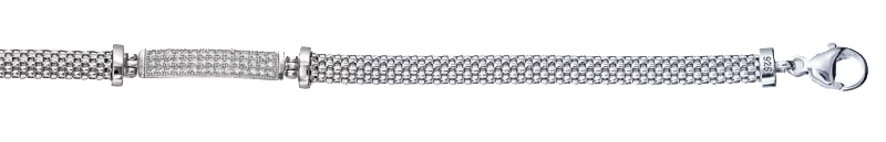 Tyylikäs hopeinen ranneketju zirkoneilla koristetulla laatalla.