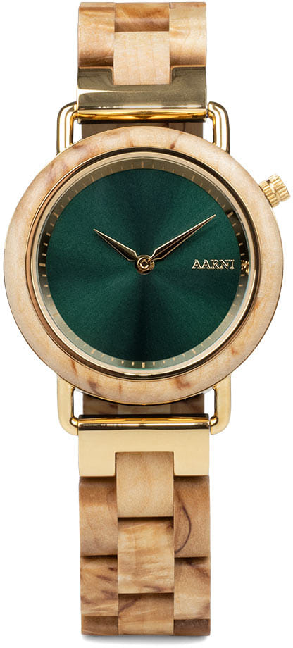 Kotimaisesta visakoivusta valmistettu naisten kello. Hartolassa kasvaneesta visakoivusta on saatu upea malli aikaan, kultaisilla yksityiskohdilla. Visakoivu on Suomen arvokkain puulaji. Jo Keski-Euroopan aatelisto on arvostanut tätä kotimaista jalopuuta. Aaltoileva pintakuvio vie ajatukset Suomen tuhansien järvien äärelle. Upea vihreänsävyinen kellotaulu vie ajatukset luontoon ja metsään.