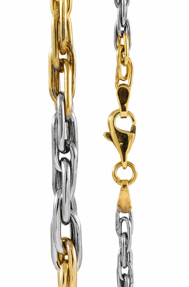 Kaunis pitkälenkki ankkuriketju, joka on hieno valko- ja keltakullan värinen.