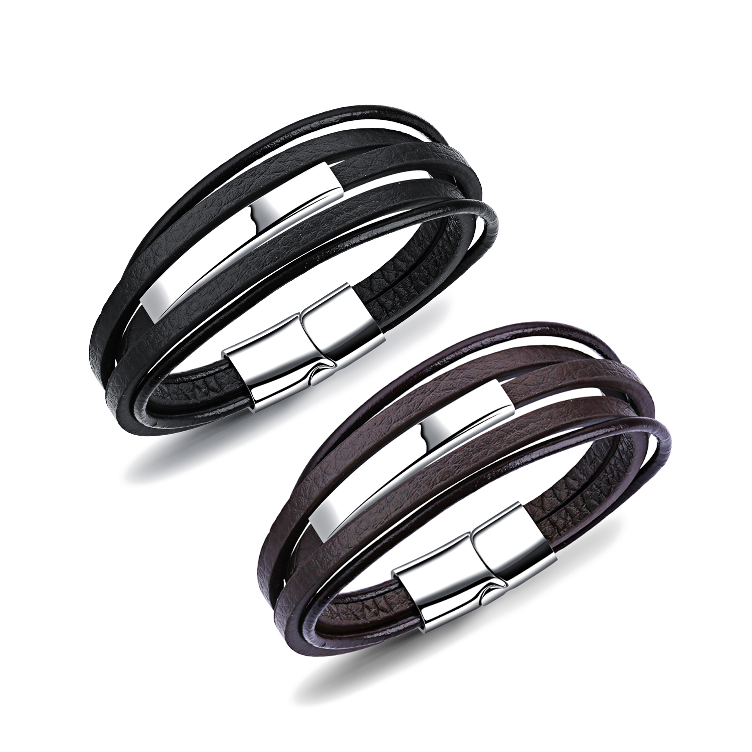 Tyylikäs useamman rannekkeen kokonaisuus teräksisellä lukolla ja kaiverrettavalla laatalla. Kaksi eri väriä, musta ja ruskea.