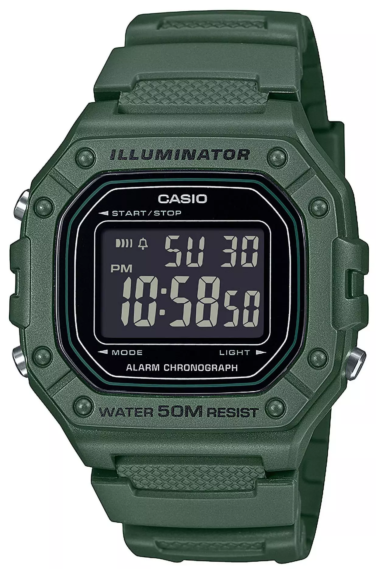Casio W-218H-3BVEF on ajattoman käytännöllinen digitaalinen rannekello, jossa yhdistyvät kevyt rakenne, selkeä näyttö ja luotettavat perustoiminnot. Vihreäsävyinen hartsikuori ja -ranneke tekevät kellosta sporttisen mutta huomaamattoman kumppanin arkeen, vapaa-aikaan ja liikuntaan. LED-taustavalo helpottaa ajan lukemista pimeässä. Kellossa on kestävä hartsikuori, muovinen lasi sekä kevyt, noin 37 gramman kokonaispaino, mikä tekee siitä miellyttävän käyttää koko päivän. Kuoren mitat ovat noin 44,4 × 43,2 × 10,8 mm, joten kellotaulu on selkeä mutta edelleen kompakti ranteessa. 1/100 sekunnin sekuntikello, päivittäinen hälytys ja tasatuntisignaali tukevat aktiivista käyttöä. Automaattinen kalenteri sekä 12/24 h aikamuoto lisäävät käyttömukavuutta. 50 metrin vesitiiviys kestää roiskeet, suihkun ja kevyen vesikäytön.