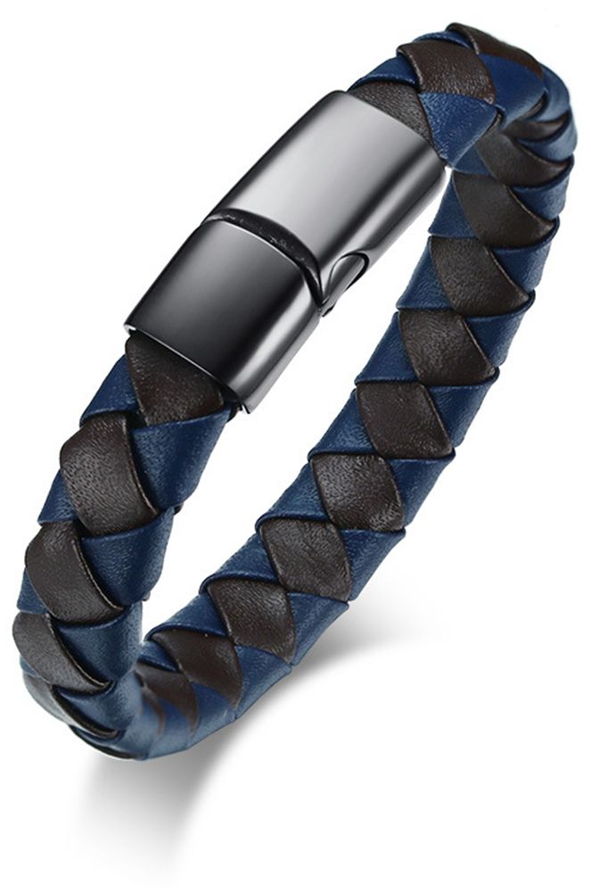 Tyylikäs punottu nahkaranneke teräksisellä lukolla.