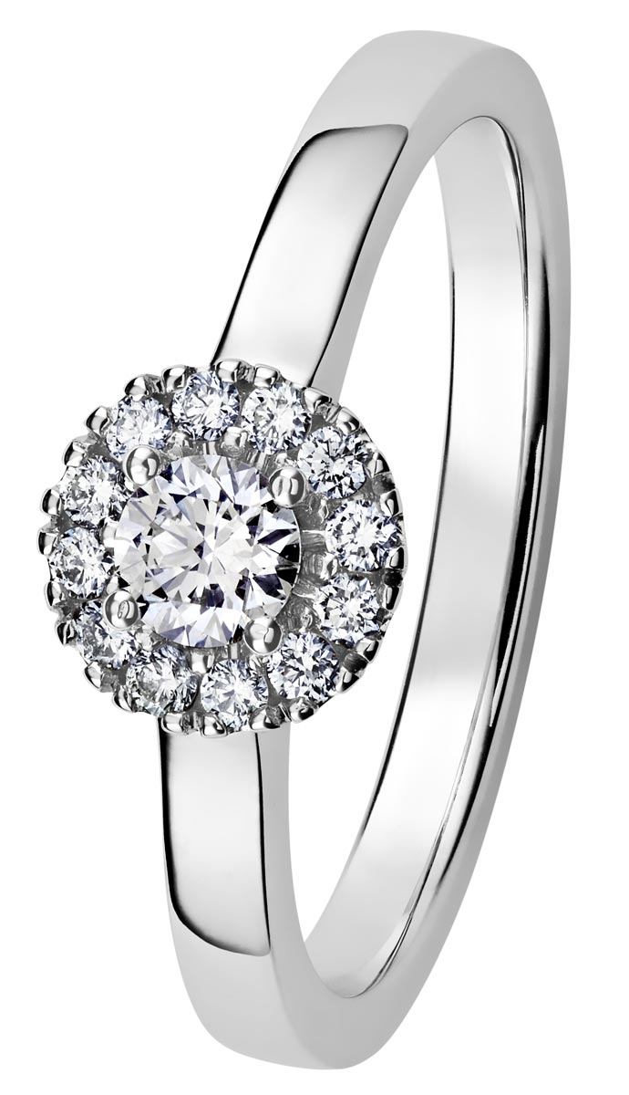 Näyttävä Kohinoor Valerie timanttisormus, jonka keskimmäisenä kivenä loistaa 0,18 karaatin painoinen timantti. Sormuksen näyttävyyttä korostaa keskimmäistä timantia reunustavat 12 timanttia, joiden yhdeispaino on 0,12ct
