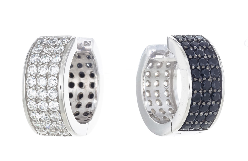 Hopeiset korvakorut, jossa edessä musta ja takana kirkkaita zirkoneita.