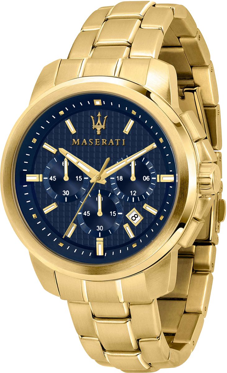 Maserati Successo rannekello on todella näyttävä Maserati-uutuus! Kellorunko ja ranneke on materiaaliltaan ruostumatonta terästä. Ne hehkuvat kuitenkin arvokasta keltakultaista hehkua. Kellotaulun halkaisija on 44 mm. Kellotaulun pienemmät kellotaulut on varattu ajanottotoiminnoille sekä 24-tunnin näytölle. Tummansinisestä taustasta keltakullan väriset osoittimet ja indeksit erottuvat selkeästi. Jälkihehkun ansiosta ajan pystyy tarkistamaan pimeässäkin. Kellotaulusta on tarkistettavissa myös päivämäärä. Kellotaulua suojaa sirpaloitumaton mineraalilasi.