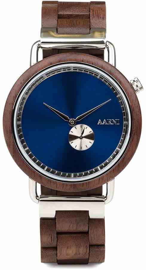 Aarni Sirius sarjan pähkinäpuinen versio sinisellä kellotaululla. Aarni Sirius kellojen halkaisija on 42mm ja niiden sydämenä sykkii laadukas Miyota-koneisto