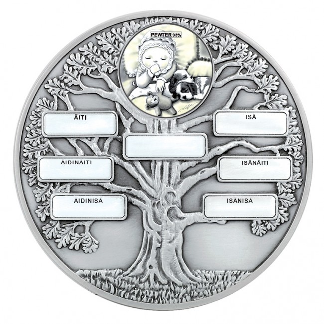 Tinasta valmistettu kastekehys, jossa aiheena sukupuu. Tauluun voi kaiverruttaa lapsen nimen lisäksi äidin, isän, äidinäidin, äidinisän, isänäidin ja isänisän nimet. Lautasen koko on 17 cm. 078263