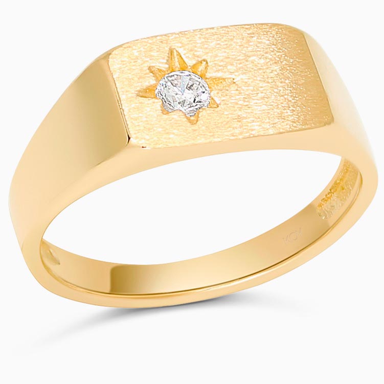 Tämä malli on valmistettu 14 karaatin keltakullasta ja sen satiinipintaiseen kantaan on istutettu säihkyvä zirkoni.