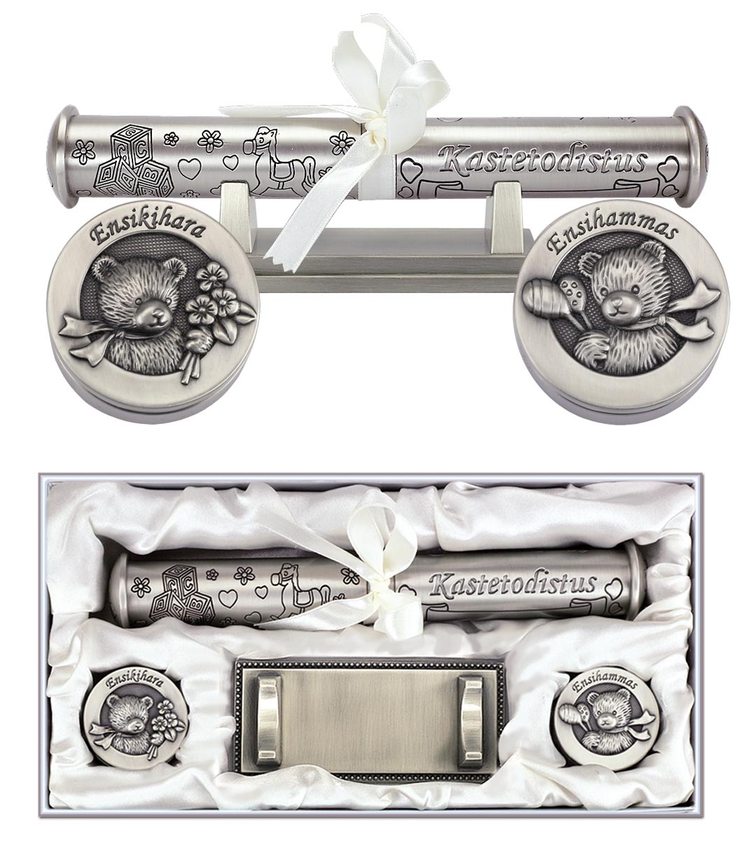Ihanat kastelahjat helposti ja nopeasti verkkokaupastamme! Kastetodistus jalustalla sekä ensikihara ja -hammas rasiat 078746 Lahjapaketti, johon kuuluu tinainen kastetodistus jalustalla, ensikihara rasia sekä ensihammas rasia. Kaunis kokonaisuus, jonka avulla elämän ensimmäisiin tärkeisiin tapahtumiin liittyvät asiat pysyvät paremmin tallessa.