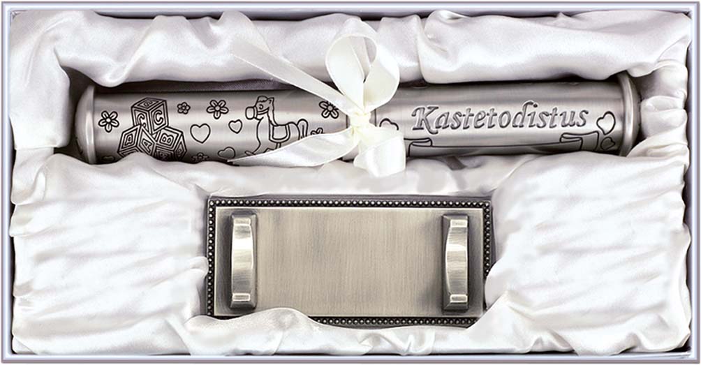 Suosikkituote tekee paluun! Kultatähden kastetuotteiden yksi kautta aikain suosikkituote, kastetodistusputki jalustalla on helppo tapa säilyttää lapsen kastetodistus, sekä kaivertaa esimerkiksi lapsen nimi ja kastepäivä. Putken pituus on noin 23cm ja jalustan koko puolestaan 12,5x4,5cm. Itse putkeen on mahdollista tehdä kaiverrus, kuten nimi ja kastepäivä. Jalustaan voidaan puolestaan kaivertaa kaikki loput tiedot, esimerkiksi paino, pituus, syntymäpäivä ja kellonaika. Sekä todistusputki että jalusta ovat tinattuja ja niiden pinta on myös lakattu, mikä vähentää tuotteen tinatun pinnan kulumista.