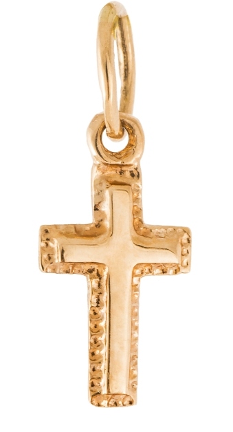 Siro 14 karaatin keltakullasta valmistettu risti, jossa on timanttileikkaukset reunoissa.