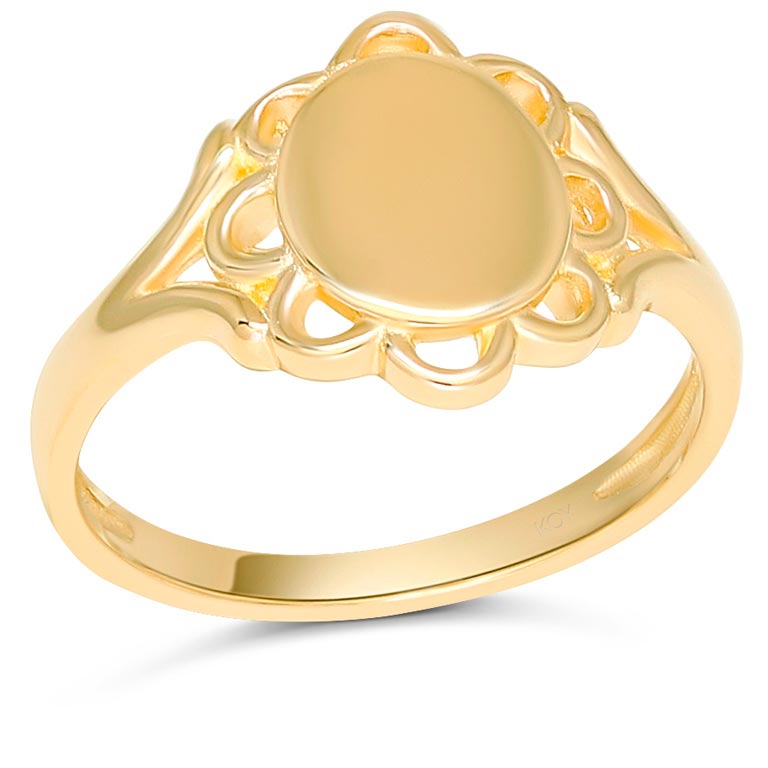 Ihastuttava kultainen kastesormus, jonka ovaalin muotoista kantaa reunustaa herkkä terälehtikuvio.