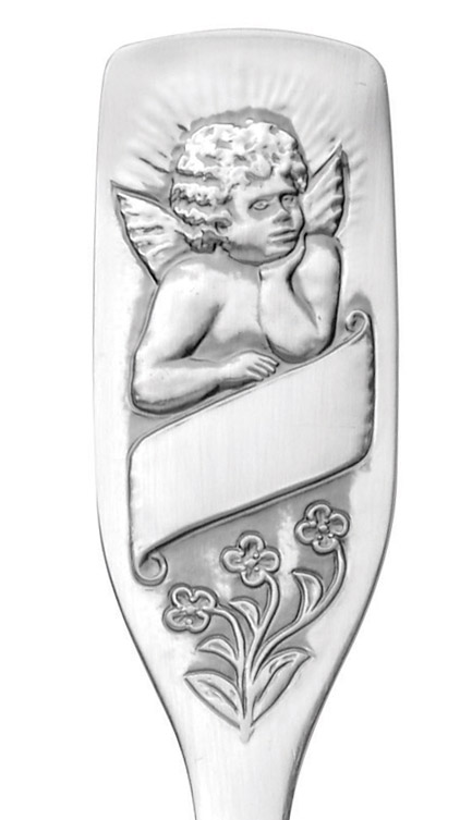 Kummilusikka, jonka lavassa on lasta suojeleva enkeli.