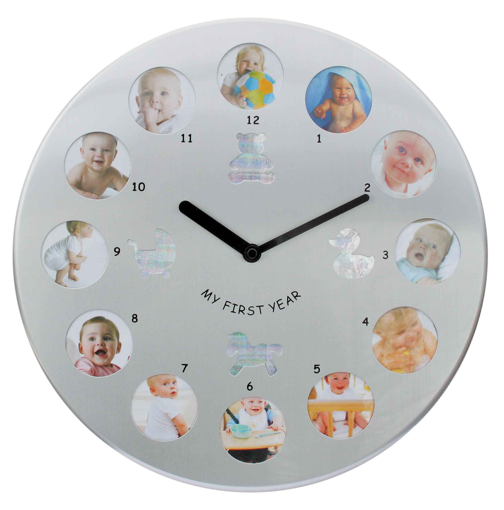 Tähän tuotteeseen on yhdistetty kaksi tuotetta: kehys ja kello. Jokaisen tunnin kohdalle saat laitettua rakkaimpasi kuvan. Ykkösen kohdalle yhden kuukauden vanhana otettu kuva, ja kahdentoista kohdalle 1-vuotis kuva.