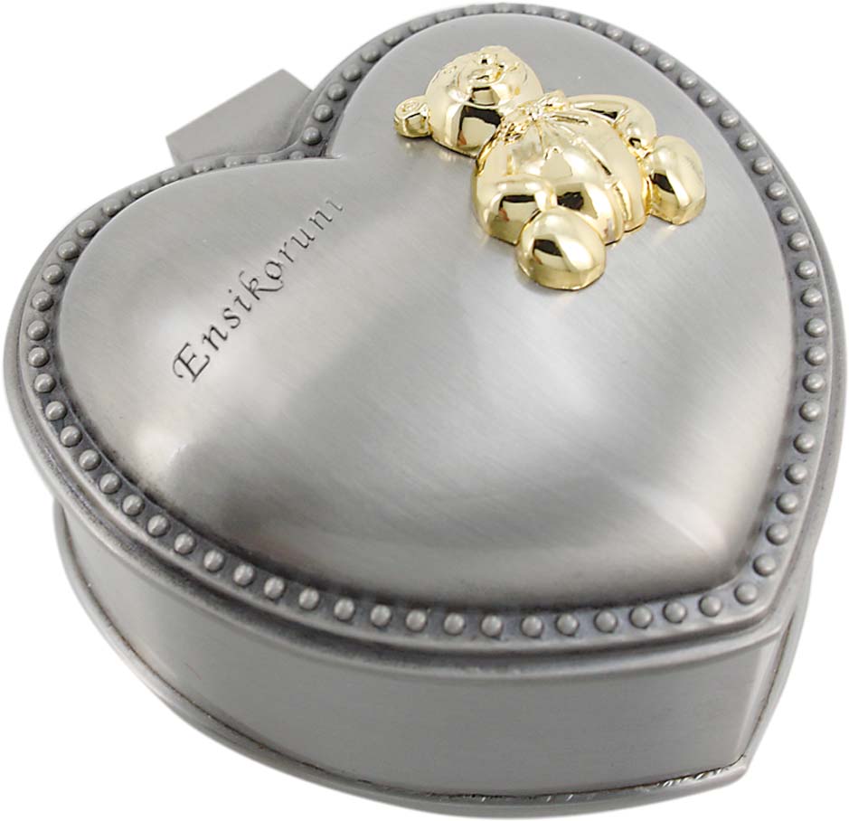 Ensikoruni korurasia 078694 Kaunis sydämen muotoinen korurasia on oiva vaikkapa syntymäpäivä- tai kastelahjaksi. Rasiaa koristaa kullanvärinen nalle, joka on koholla muun rasian pinnasta, antaen... Lue lisää