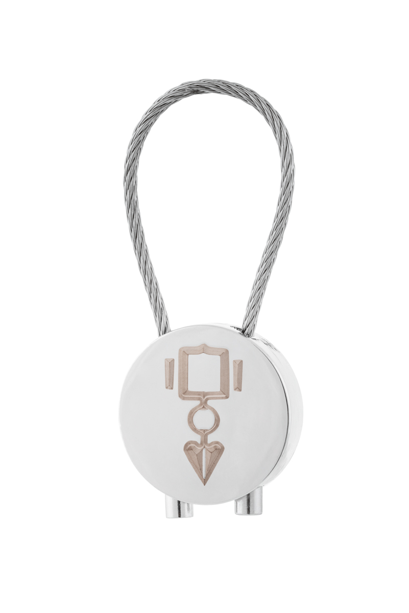 Kätevä teräksinen avaimenperä vaijeri lukituksella. Avaimenperässä on toiselle puolelle kuvioitu helan kuva ja toiselle puolella voi vaikkapa kaiverruttaa avainnipun omistajan nimen.