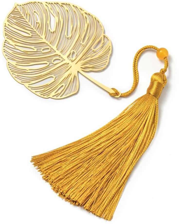 Tyylikäs, elegantti ja epätavallinen kirjanmerkki klassisessa kullanvärisessä ja täynnä symboliikkaa Peikonlehden muodossa.