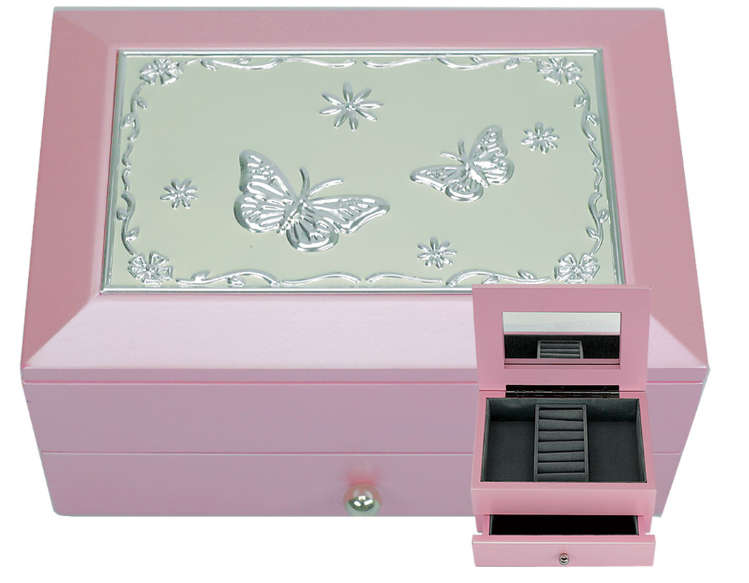 Tämä korurasia on erityisen hyvä lahja esimerkiksi pienelle päivänsankarille tai nuorelle naisen alulle. Rasiassa pysyvät korut tallessa ja järjestyksessä. Tämä rasia on myös hieno koriste-esine värinsä ja koristeellisten perhos- ja kukkakuvioiden puolesta. Rasiassa on kannessa pieni peili, yksi laatikko ja yhteensä kaksi tasoa korujen säilytykseen. Puinen rasia on maalattu vaaleanpunaiseksi ja sen sisäosat on päällystetty harmaalla samettikankaalla.