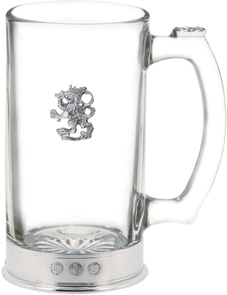 Lasituoppi tinaisella suomileijona somisteella. Korkeutta tällä kokonaisuudella on 15cm ja halkaisija 8cm. Nestettä tähän tuoppiin mahtuu 50cl