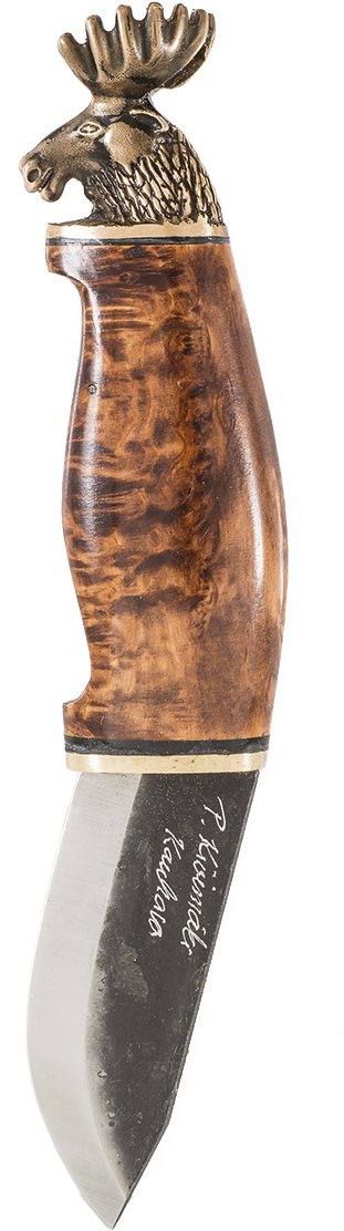Loistavasti käteen istuva Erävuolu-malli, tyylikäs hirvenpää kruunaa tämän puukon komeuden. Terien valmistamiseen käytetään korkealuokkaista hiiliterästä, sekä ruostumatonta terästä. Kahvojen materiaalina mm. Visakoivu ja messinki. Puukko säilyy komeassa ruskeassa nahkatupessa. Kotimaista käsityötä.