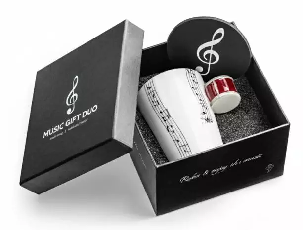 Music Gift Duo on ainutlaatuinen setti kaikille musiikin ja kauniiden yksityiskohtien ystäville. Tyylikkäässä rasiassa löydät: Keraamisen mukin, jonka kahva on muotoiltu sinisen rummun muotoon – täydellinen aamukahviin, teehen tai iltarentoutukseen suosikkisävelmiesi parissa. Jokainen siemaus maistuu hyvin soitetulta soinnulta! Silikoninen alusta – suojaa työtasoja korkeilta lämpötiloilta ja lisää ripauksen tyyliä mihin tahansa tilaan. Koko setti on pakattu lahjarasiaan, joka ihastuttaa ensisilmäyksellä. Ei ole vain käytännöllinen setti, vaan myös symboli rakkaudesta musiikkiin ja harmoniassa elämisen taiteeseen. Täydellinen lahjaidea muusikolle, opettajalle, ystävälle tai… itsellesi – jos haluat aloittaa päiväsi suosikkisävelmäsi rytmissä.