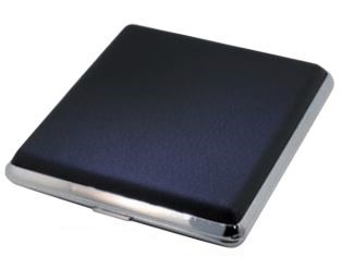 Nahkainen musta savukerasia. Rasia kaksipuolinen eli savukkeita saa kotelon molemmille sivuille lenkkien alle säilöön. Vetävyys on noin askin luokkaa.