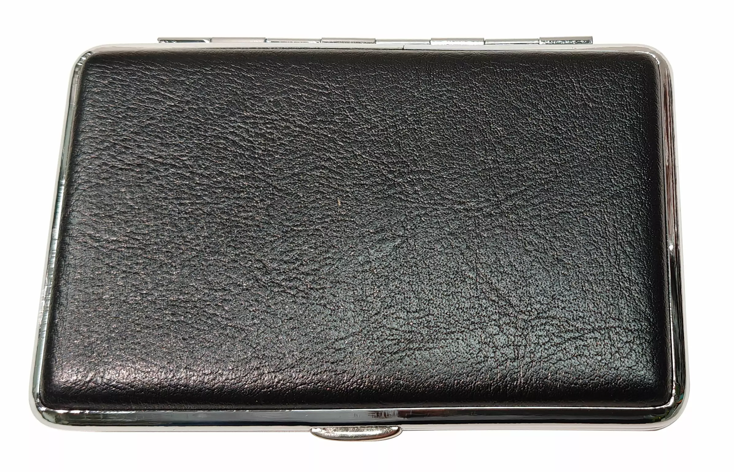 Hieno nahkainen pinta edessä ja takana, muuten kromin sävyiset pinnat. Koko 7 x 11 x 1,5 cm. Mahtuu max seitsemän savuketta per puoli eli rasia vetää yhteensä 14 kpl.