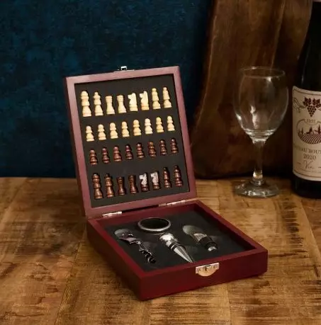 Hieno 4-osainen viinilaatikko shakkilaudalla. Ruskean sävyinen, puusta valmistettu. Sisältää korkkiruuvin, kaatonokan, pullonsulkijan ja tipparenkaan.