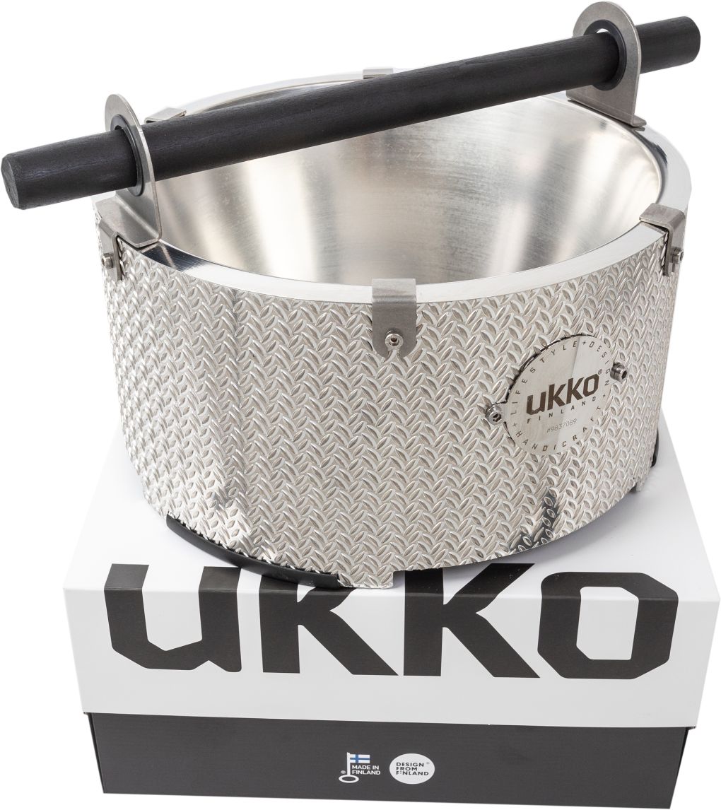 Ukko Löylykiulu XO on design-tuote, jossa yhdistyvät suomalainen käsityö, laadukkaat materiaalit ja tyylikäs, miehekäs muotoilu. Tämä näyttävä saunakiulu on valmistettu painosorvaamalla Urjalassa ja särmäämällä Pohjanmaalla, mikä takaa sen tinkimättömän laadun ja kotimaisen viimeistelyn. Materiaalina on käytetty merialumiinia ja ruostumatonta terästä, jotka tekevät kiulusta kestävän, kevyen ja pitkäikäisen.