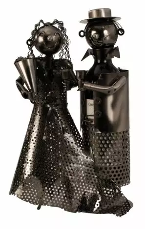 Metallista valmistettu mahtavan näköinen viinipulloteline, hääpari teemalla.