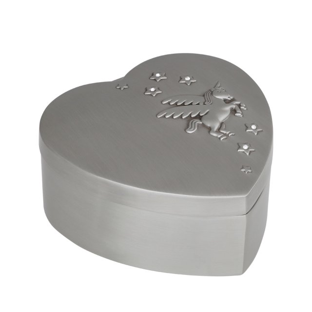 Tinasta valmistettu sydämen muotoinen korurasia jonka kannessa on yksisarvinen. Korurasia on sisäpuolelta pehmustettu.