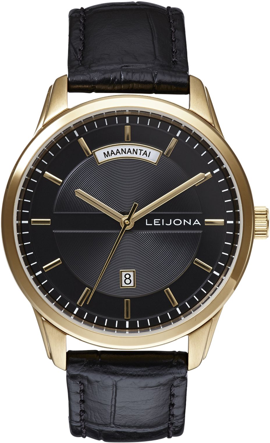 Leijona Töölö, kultadublee rannekello. Tyylikäs malli, 37,5mm halkaisijalla, mustalla nahkarannekkeella ja taululla. Kultaisen sävyiset indeksit ja viisarit, kello 12:sta suomenkielinen viikkopäivyri ja kello kuudessa päivämääränäyttö.