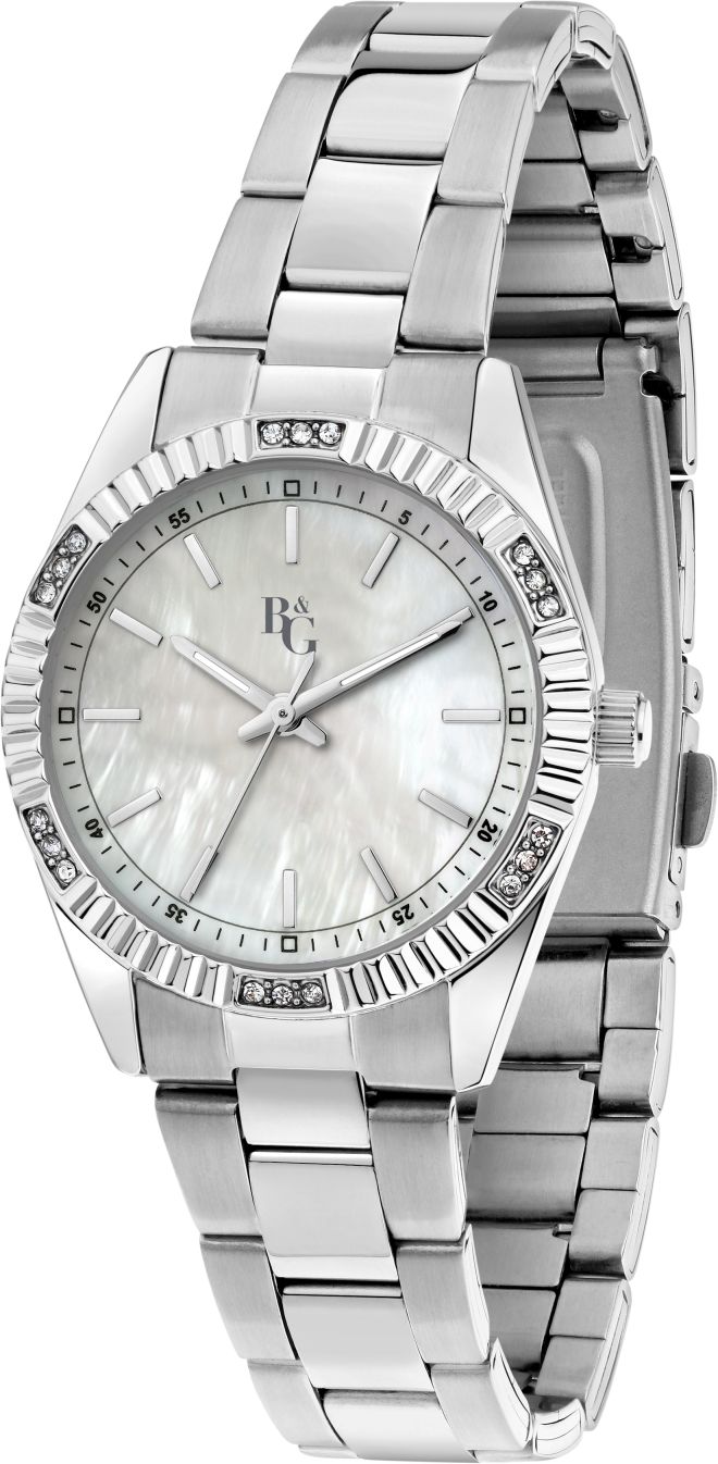 B&G:n Luxury tuoteperheen naisten rannekello. Hopean/teräksen sävyinen kello kauttaaltaan, koristekivet kellotaulun kehällä. Hiukan helmiäistyylinen kellotaulu, selkeillä indekseillä.