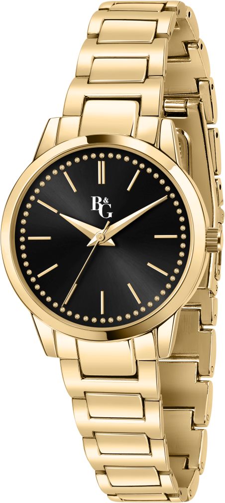 B&G:n Crystal-malliston naisten rannekello. Keltakullan värinen runko sekä ranneke. Mustassa kellotaulussa keltakultaisen väriset indeksit ja osoittimet.