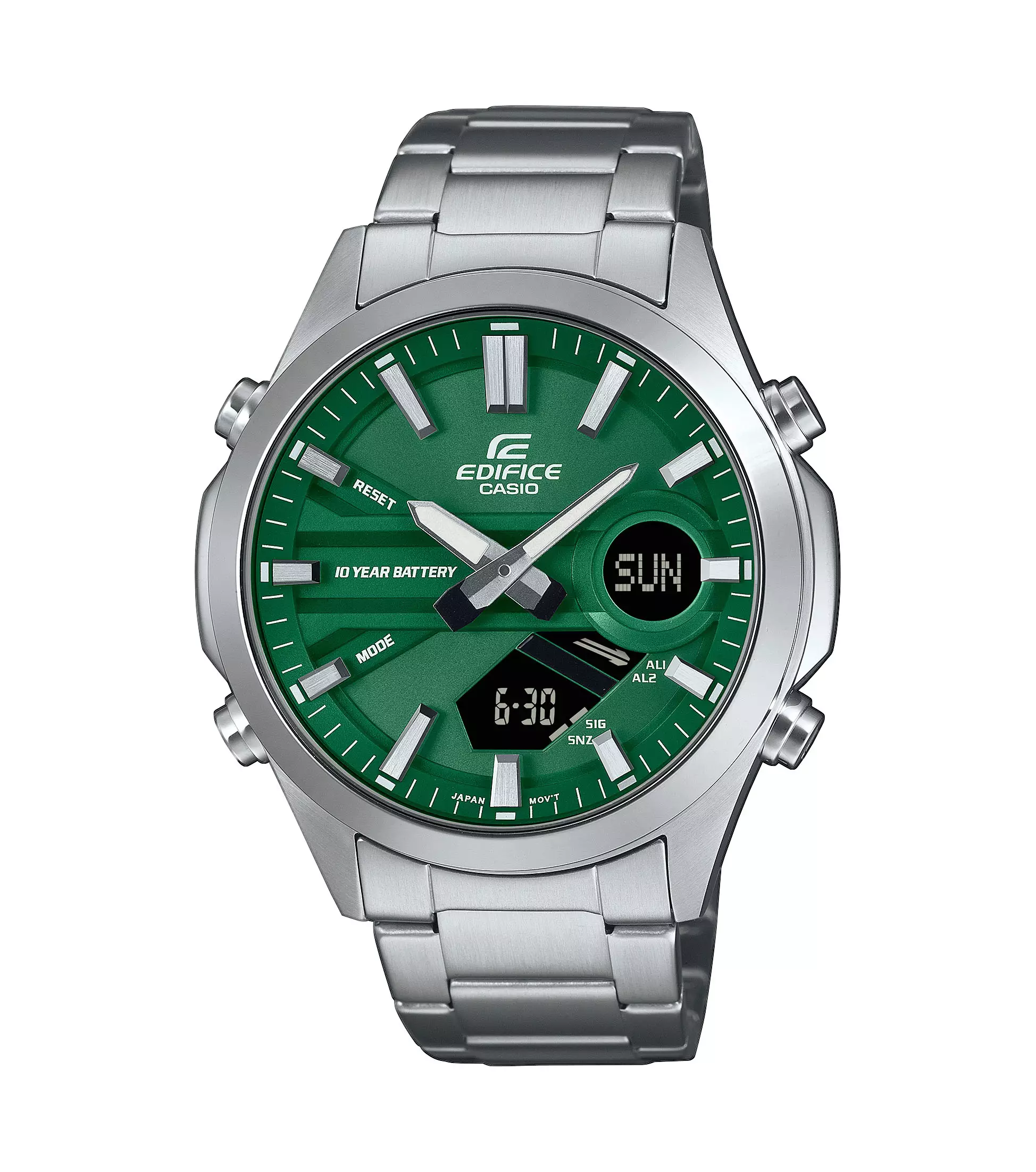 Casio Edifice EFV-C120D-3AEF yhdistää dynaamisen sporttityylin ja monipuoliset digitaaliset toiminnot laadukkaaseen kvartsikelloon. Vihreä taulu ja teräksinen ranneke tekevät kellosta huomiota herättävän, mutta samalla käytännöllisen valinnan aktiiviseen elämäntyyliin.