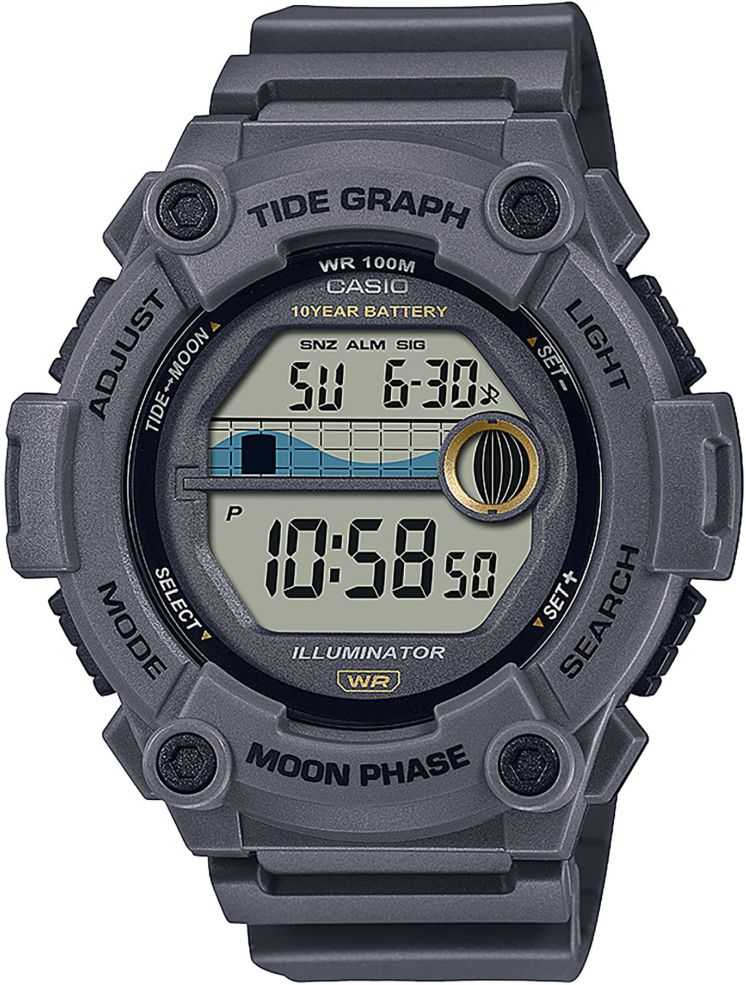Kellossa on digitaalinen näyttö, joka tarjoaa selkeän ajanlukuominaisuuden ja kattavat toiminnot. Kello on varustettu kuun vaiheen ja vuoroveden näytöllä, mikä tekee siitä täydellisen valinnan vesiurheilijoille ja kalastajille. Lisäksi se sisältää sekuntikellon, ajastimen, viisi päivittäistä hälytystä sekä automaattisen kalenterin.