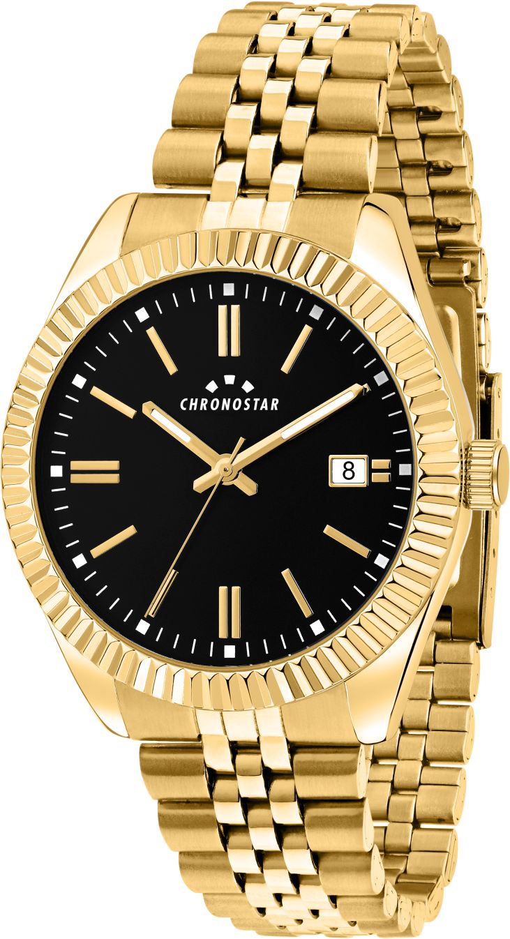 Chronostar Daily R3753312005 tarjoaa yksinkertaista ja eleganttia muotoilua, joka sopii täydellisesti jokapäiväiseen käyttöön. Kultaisen värinen metalliranneke ja kellotaulun kehä. Mustalle kellotaulun pohjalle istuvat hienosti kullanväriset osoittimet ja indeksit. Tämä malli on myös varustettu päivyrillä, mikä löytyy kello kolmesta.