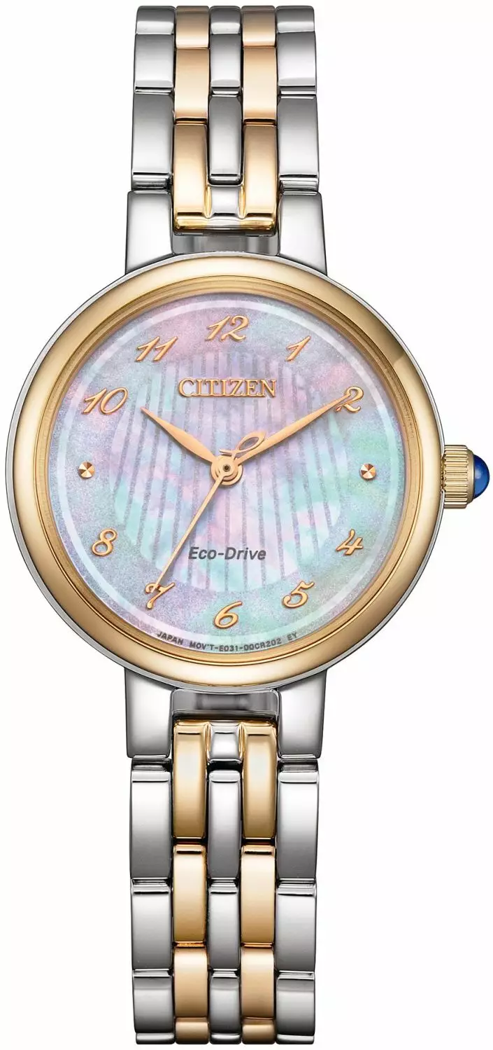 Citizenin Eco-Drive malliston naisten rannekello. Todellinen esimerkki siitä, miten hienostunut muotoilu ja teknologia voivat yhdistyä saumattomasti. Sen 28 mm ruostumattomasta teräksestä valmistettu runko huokuu hillittyä eleganttiutta ja on mitoitettu niin, että se asettuu sirosti ranteeseen mutta säilyy silti huomiota herättävänä. Helmiäistyylinen hohtava kellotaulu. Lasina toimii korkealaatuinen safiirikristalli, joka takaa kellotaululle erinomaisen suojan arjen käytössä.