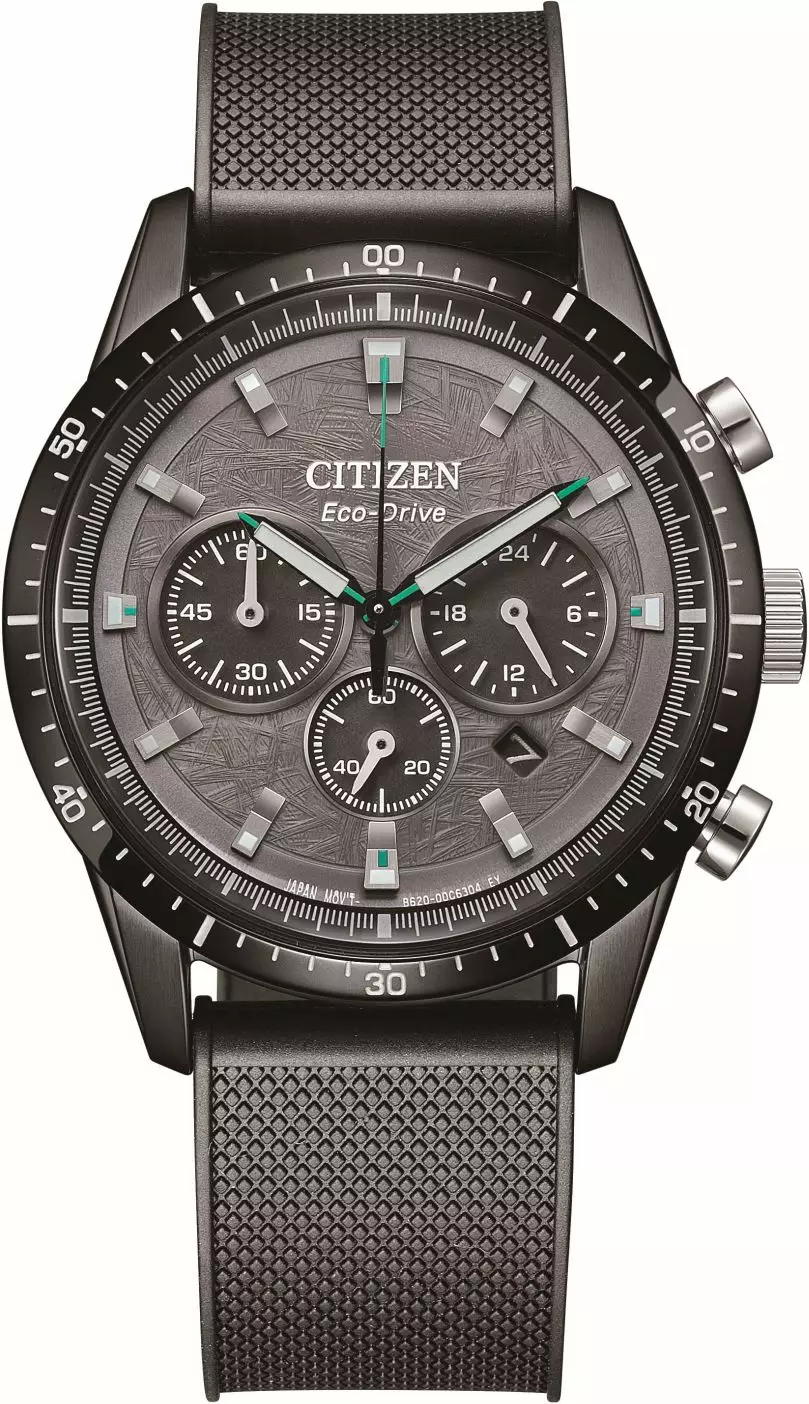 Tämä Citizenin malli on moderni kronografikello, joka yhdistää urheilullisen muotoilun ja tyylikkään tumman värimaailman. Harmaa kellotaulu, ja vihertävän sävyiset yksityiskohdat viisareissa sekä indekseissä, luovat kellolle dynaamisen ja näyttävän ilmeen. Musta polyuretaaniranneke viimeistelee kokonaisuuden, joka istuu ranteeseen mukavasti ja kevyesti.