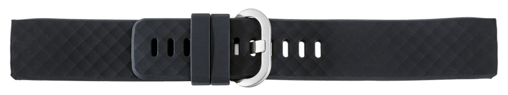 Silikonista valmistettu musta ranneke Fitbit Charge 3 -älykelloon, joka sopii erityisesti fyysiseen harjoitteluun. Solkilukko ruostumattomasta teräksestä. Pituus n. 215mm.