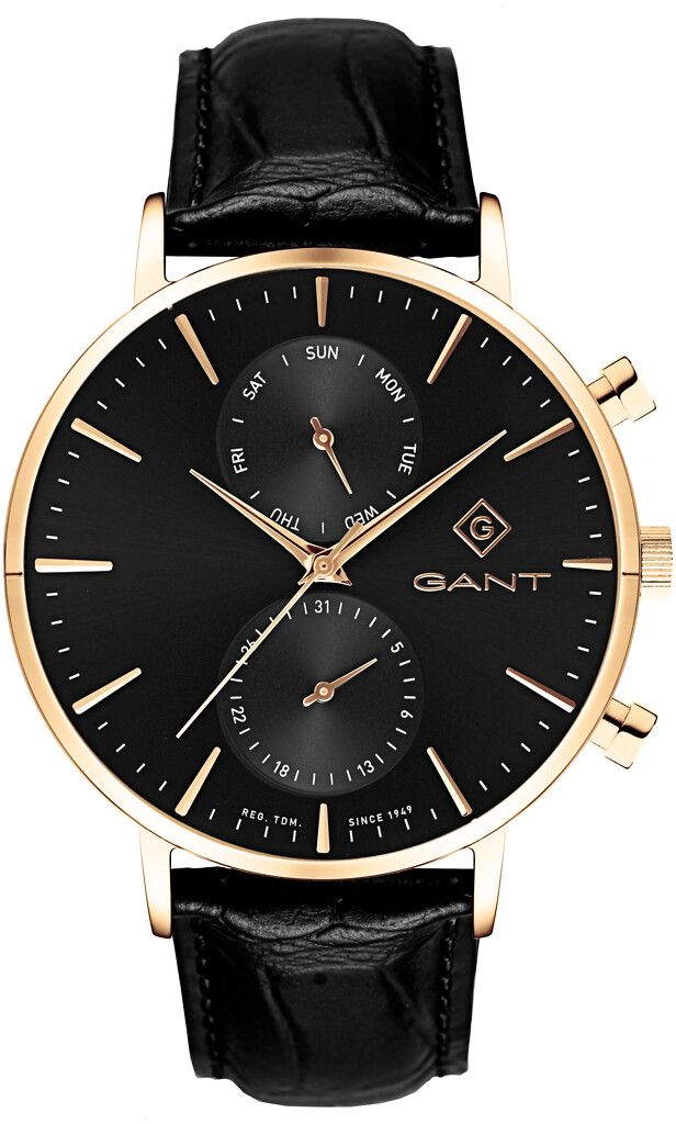 Gant G121005 kellossa on synkän musta kellotaulu ja siihen sopiva ranneke, kullan väriseksi ion plating tekniikalla kullattu kellorunko luo tyylikkään yhdistelmän mustan rinnalla.