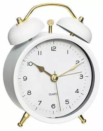 Retro herätyskello, valkoisen värisenä. Kellon korkeus 13,5 cm ja leveys 9,7 cm. Ruusukullan sävyiset osoittimet. Ei kilise retrosta huolimatta, vaan aivan normaali piip-piip hälytysääni.