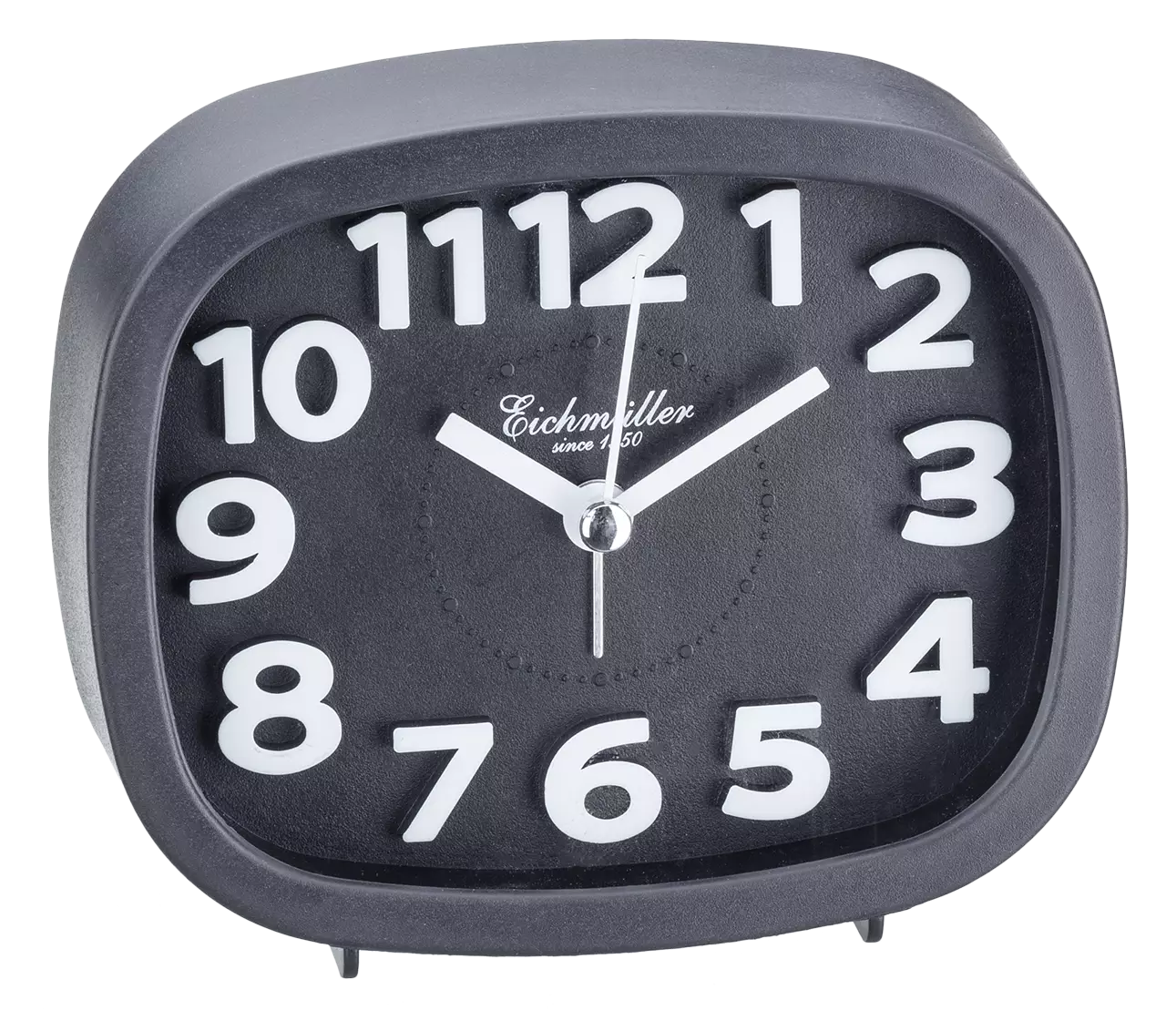 Useassa värissä saatavilla oleva Eichmullerin valmistama herätyskello. Koko 12 x 10 cm. "Hiipivä" sekuntiosoitin eli äänetön käynti. Toimii yhdellä AA-paristolla.