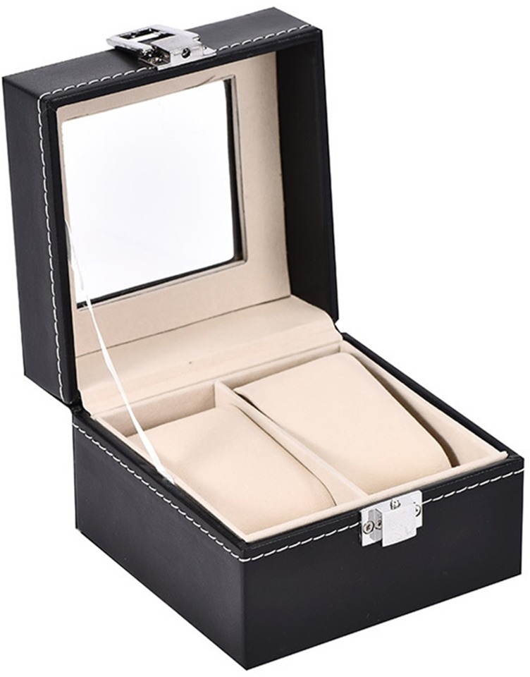 Ei se määrä vaan laatu-lausahdus tulee mieleen silmäillessä tätä pientä kellorasiaa. Kellorasiassa on paikka tasan tarkkaan kahdelle kellolle. Yhden paikan leveys on 48 mm ja pituus 97 mm. Kellotyynyn leveys on 43 mm ja pituus 80 mm. Varsinaisen rasian mitat ovat 11 cm kummaltakin kyljeltä. Korkeutta rasialla on 8 cm. Materiaali on musta keinonahkaa, jotenmikään elollinen otus ei ole heittänyt henkeään tämän laatikon valmistamisen vuoksi. Kontrastia rasiaan luo valkoiset tikkaukset. Kellolaatikon kannessa on pieni akkuna, josta kelloja pääsee ihastelemaan avaamatta kellolaatikon kantta.