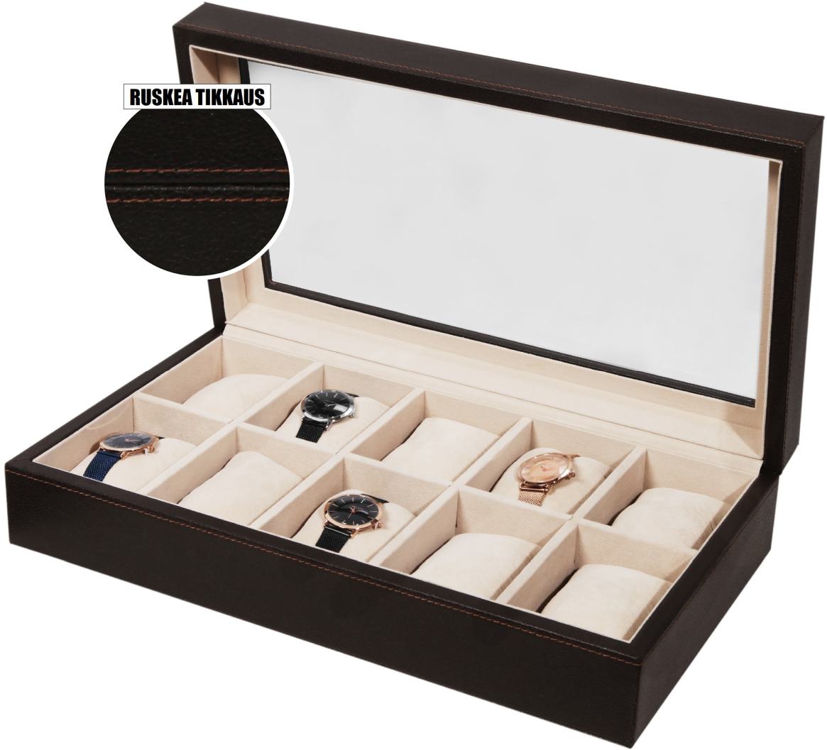 Kellolaatikko kymmenelle kellolle ruskealla tikkauksella